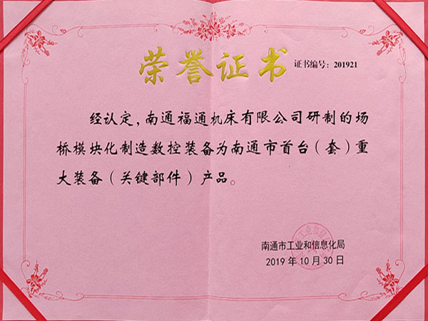 公司通過ISO9001:2015質(zhì)量體管理系認(rèn)證、ISO14001:2015環(huán)境管理體系認(rèn)證、ISO45001:2018職業(yè)健康安全管理體系認(rèn)證、先后榮獲:中國機(jī)床行業(yè)十佳品牌、江蘇名牌產(chǎn)品、江蘇省質(zhì)量信得過企業(yè)、南通市科學(xué)技術(shù)進(jìn)步獎、南通市AAA級重合作守信用企業(yè)、高新技術(shù)企業(yè)、南通市首臺(套)重大裝備產(chǎn)品等榮譽(yù)。